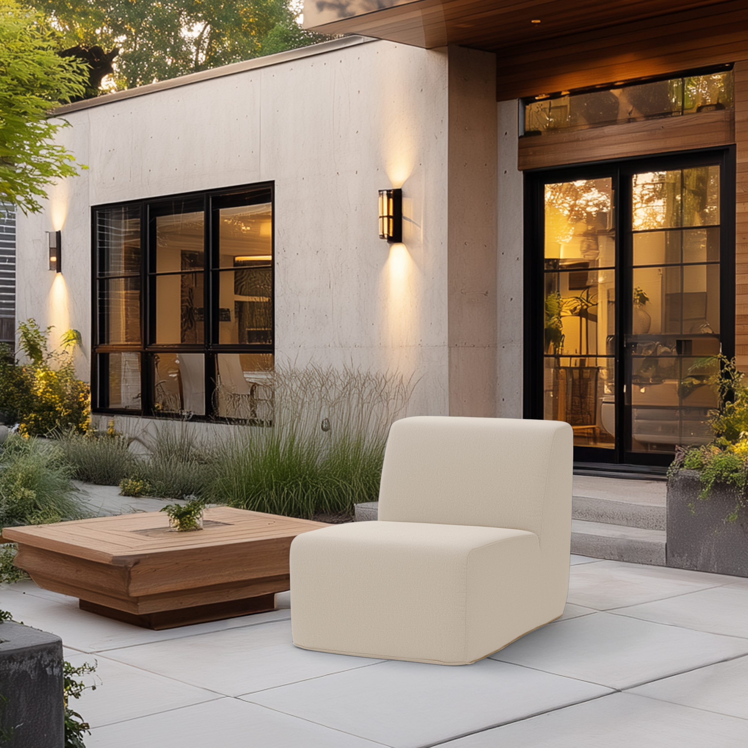 Deko Living Beige Outdoor Compression Foam Armless Sofa Chair Bring modern style and comfort to your patio with the Deko Living Beige Outdoor Compression Foam Armless Sofa Chair. Featuring high-density polyurethane foam (44 ILD) for maximum support, this chair is perfect for extended outdoor lounging. The removable, weather-resistant vinyl-coated polyester seat cover ensures durability and easy cleaning. Backed by a one-year limited warranty for confidence and peace of mind.